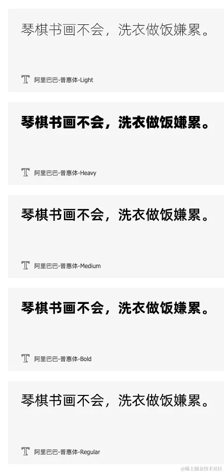 再比如,前段时间,阿里巴巴开源的普惠字体,也是支持多种粗细的: