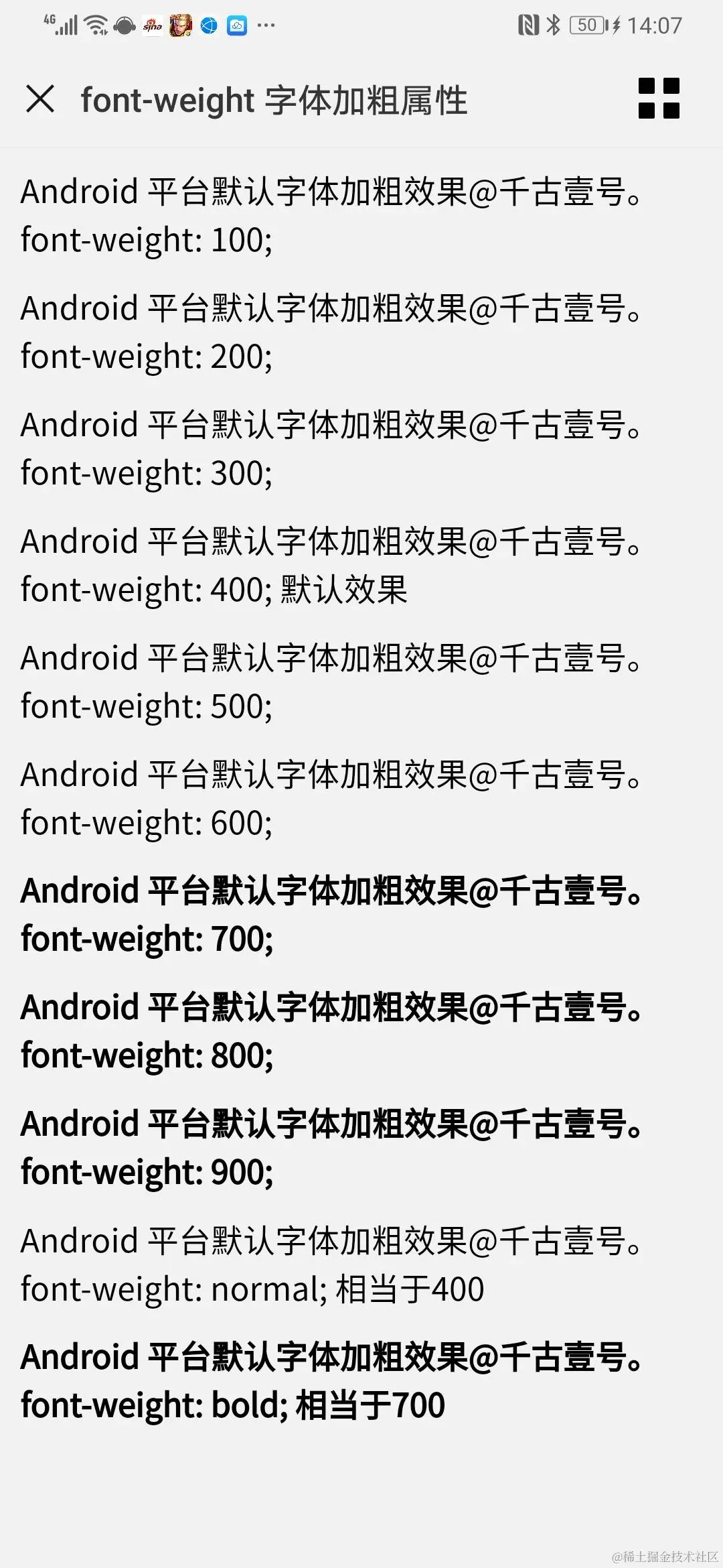 4、Android 平台(华为 P30 Pro)的默认字体加粗效果:(Droid Sans 字体)