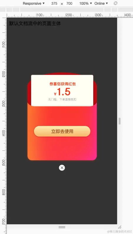 移动端场景,这里提供一个 红包幕帘/弹窗 的居中写法。注意,是严格居中,非常标准。为什么是移动端?你有见过PC网页端给你送红包的么?