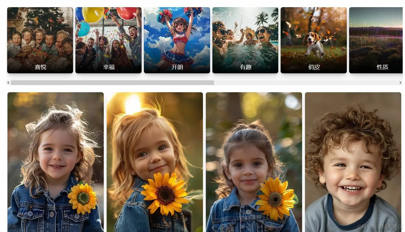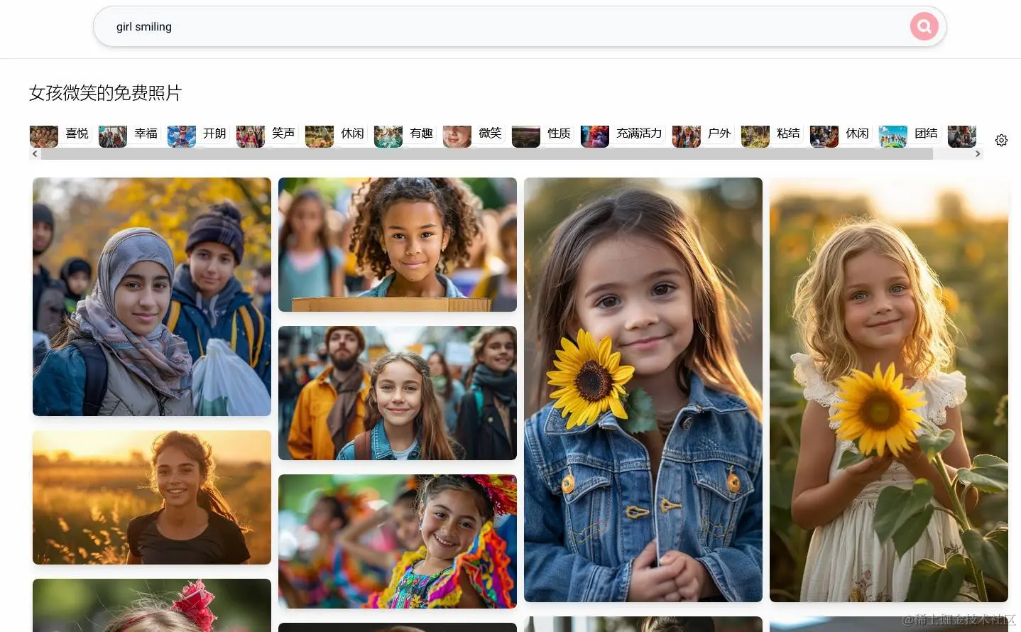 进入首页,你既能通过搜索框输入关键词,找寻所需的 AI 图片,也能直接浏览下方最近生成的图片。不仅能用英文关键词搜索,还支持中文搜索,输入中文关键词,同样能找到想要的图片。比如我现在输入了一个 “girl smiling”它把图库中微笑的女孩都展示了出来,真是把我吓住了,不敢相信图像中的人物全部是AI生成的。太生动了。
