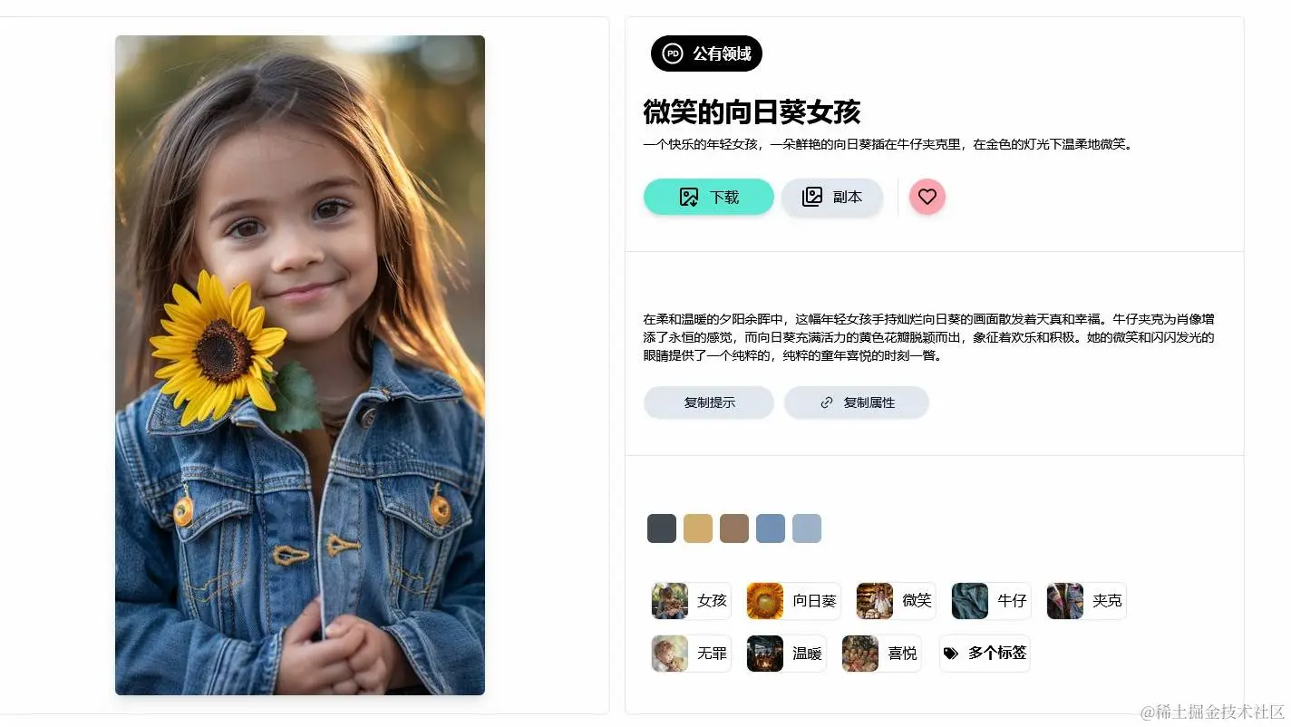 将图片往下拉,能看到生成该图片所用的 Promote(提示词)。若你对一些 AI 图片生成工具有所了解,便可参考这些提示词来自行生成图片,或借此学习,从而找到适合自己的“提示词”。
