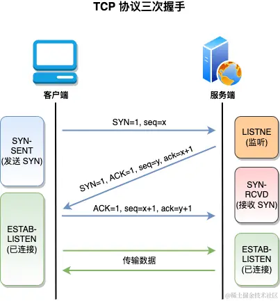 第一次握手(SYN): 客户端向服务器发送一个带有SYN(同步)标志位的数据包,用于请求建立连接。该数据包中会携带客户端的初始序列号。