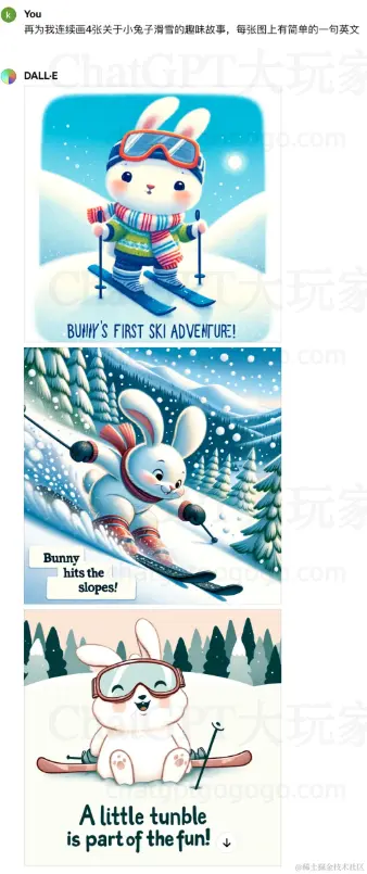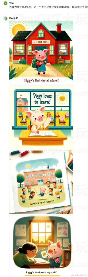 DALLE 能够连贯地创建出4页的绘本故事,并且成果相当出色。