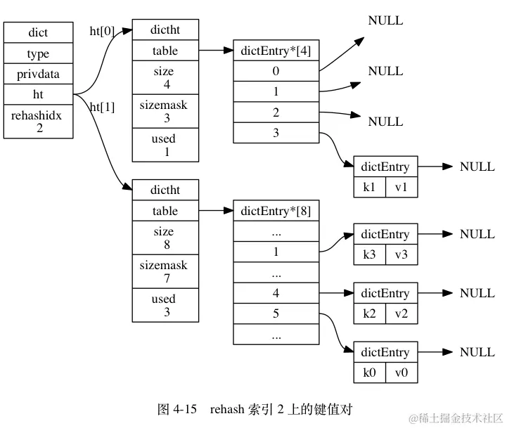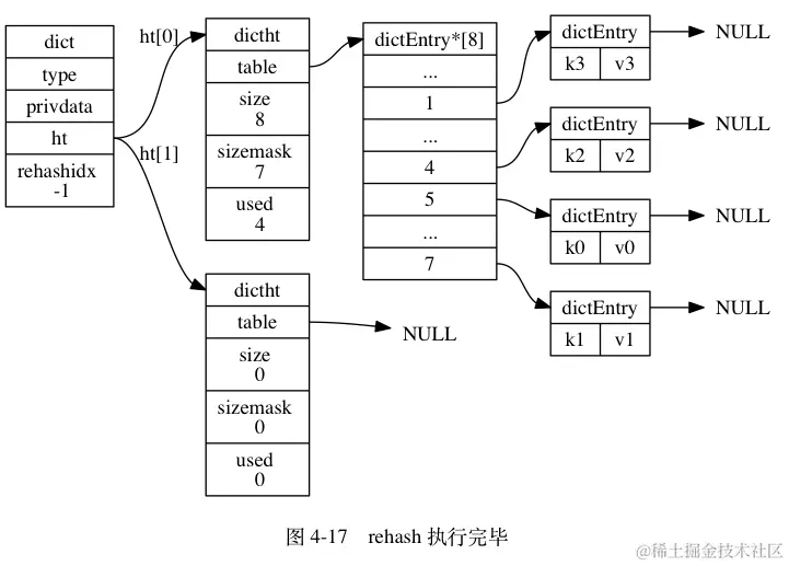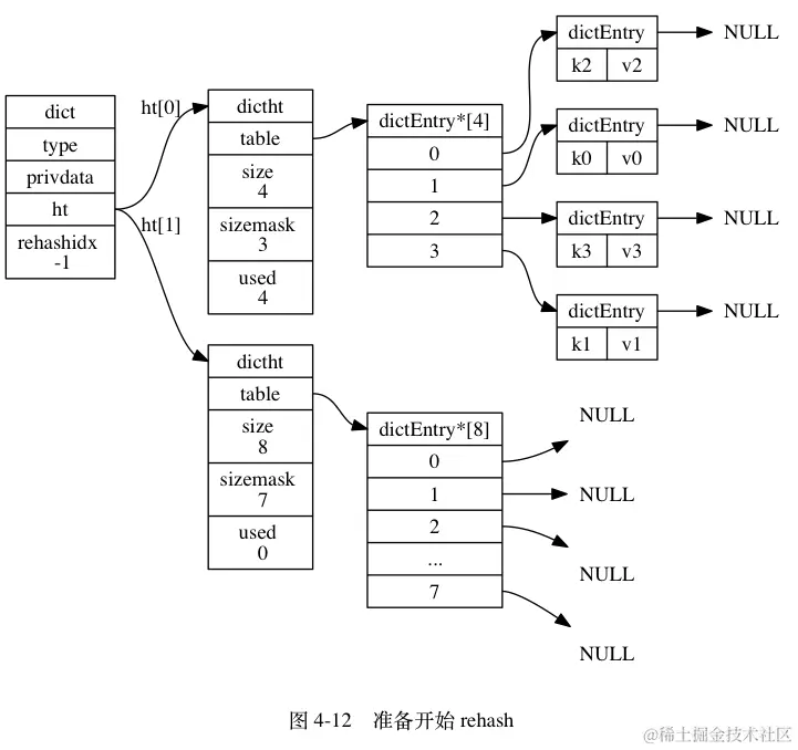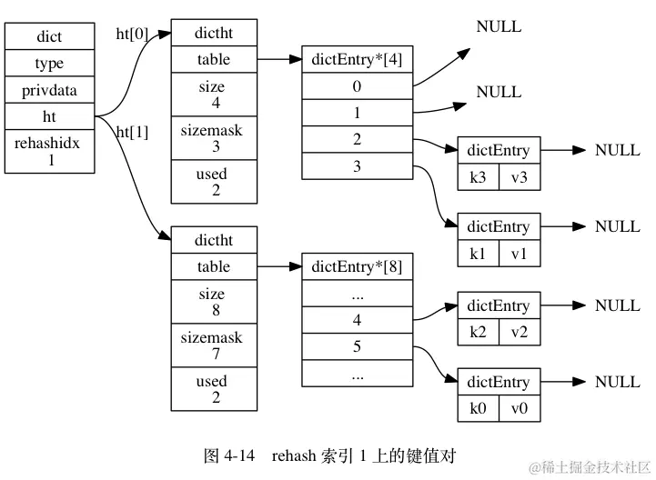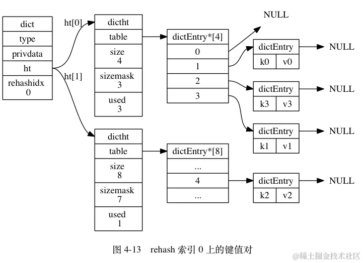 - rehashidx 属性: 记录 rehash 进度的状态值,在没有进行 rehash 时,它的值为 -1。