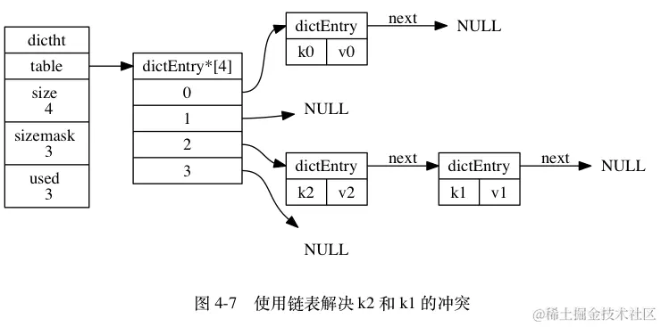 假设一个键值对 k2 和 v2 添加到字典(字典没有进行扩容操作),假设使用哈希函数计算出的 hash = 8,计算出的 index = 0 ,因此 k2 和 v2 键值对存放在哈希表 ht[0] 中索引为 0 的节点上;