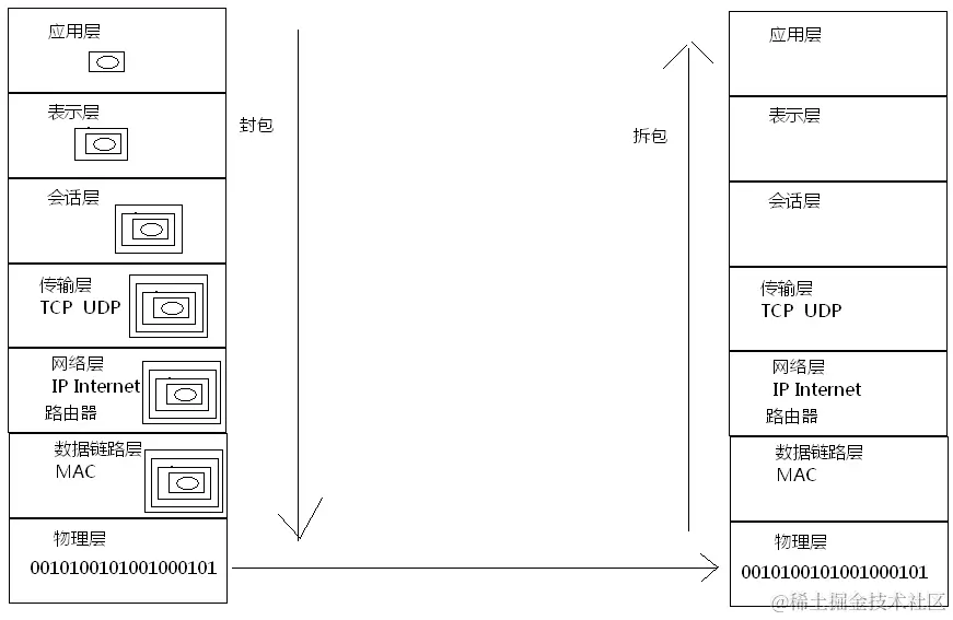 - 物理层 主要定义物理设备便准,如网线的接口类型、光纤的接口类型、各种传输介质的传输速率等。它主要作用是传输比特流(就是由1、0转化为电流强弱来进行传输,到达目的地后在转化为1、0,也就是我们常说的数模转化与模数转化)。这一层的数据叫做比特。