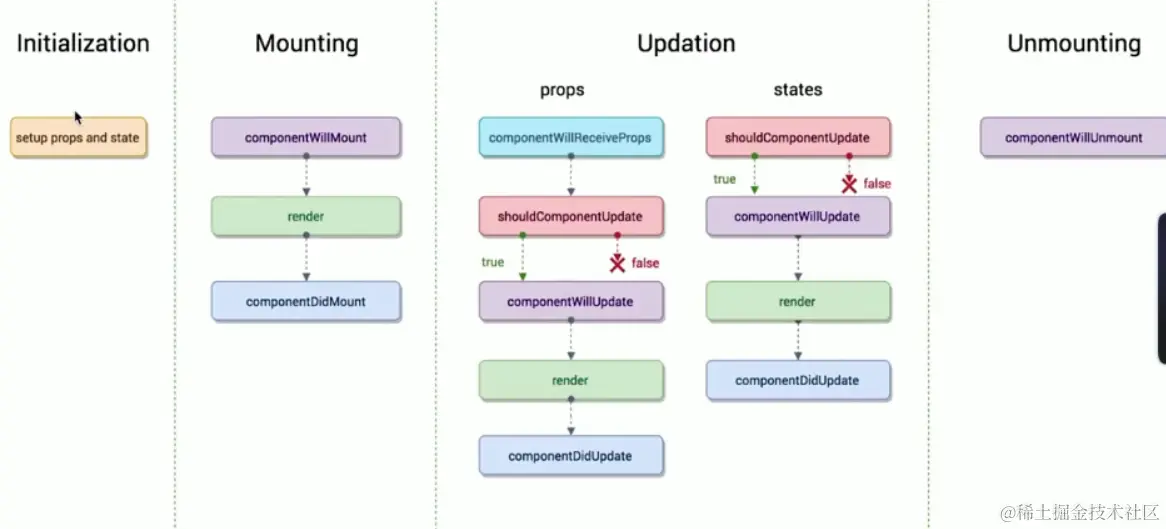 componentWillRecevieProps->shouldComponentUpdated(组件更新之前会被执行,要求返回一个布尔类型的结果)