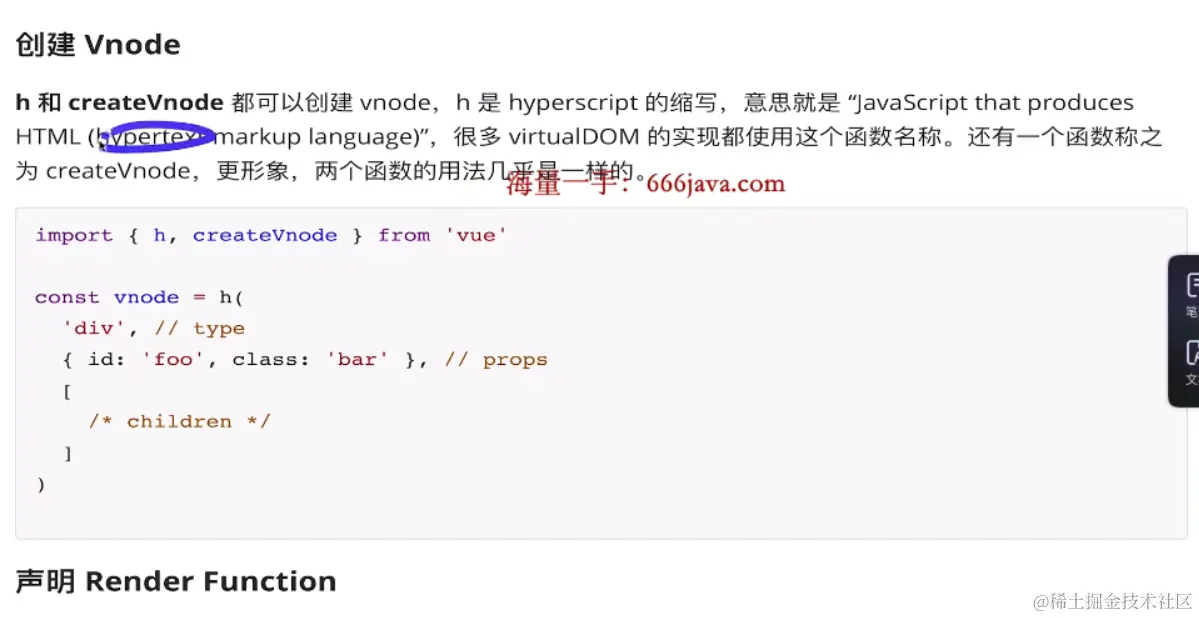 h 和 createVnode 都可以创建 vnode,h 是 hyperscript 的缩写,意思就是 “JavaScript that produces HTML (hypertext markup language)”,很多 virtualDOM 的实现都使用这个函数名称。还有一个函数称之为 createVnode,更形象,两个函数的用法几乎是一样的。