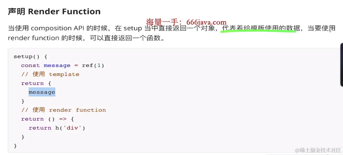 当使用 composition API 的时候,在 setup 当中直接返回一个对象,代表着给模版使用的数据,当要使用 render function 的时候,可以直接返回一个函数。