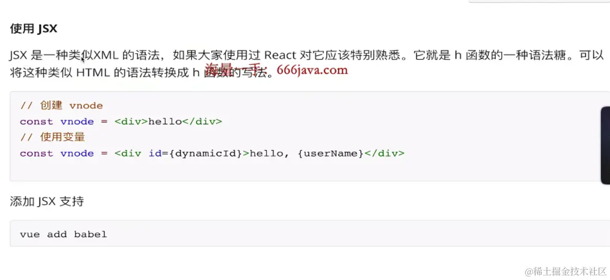 JSX 是一种类似XML 的语法,如果大家使用过 React 对它应该特别熟悉。它就是 h 函数的一种语法糖。可以将这种类似 HTML 的语法转换成 h 函数的写法。