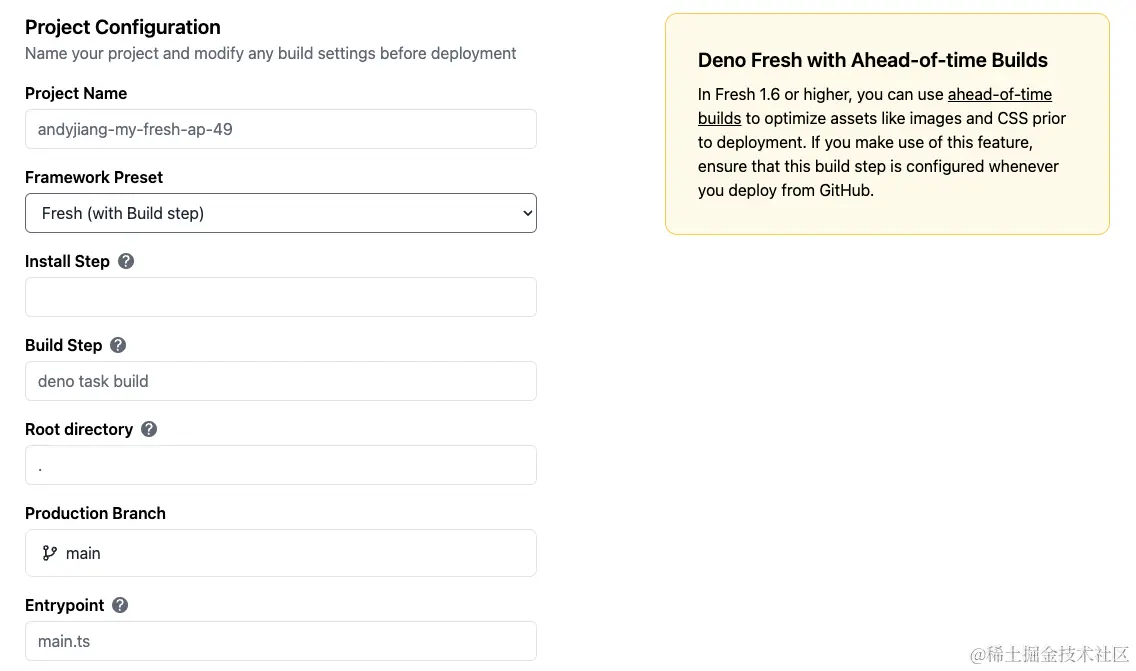 由于 Deno Deploy 检测到我的项目正在使用 Fresh 框架,因此它自动选择了 Fresh (Automatic) 框架预设。这些配置步骤是根据您的项目量身定制的,特别是它使用的框架,从而简化了设置过程。