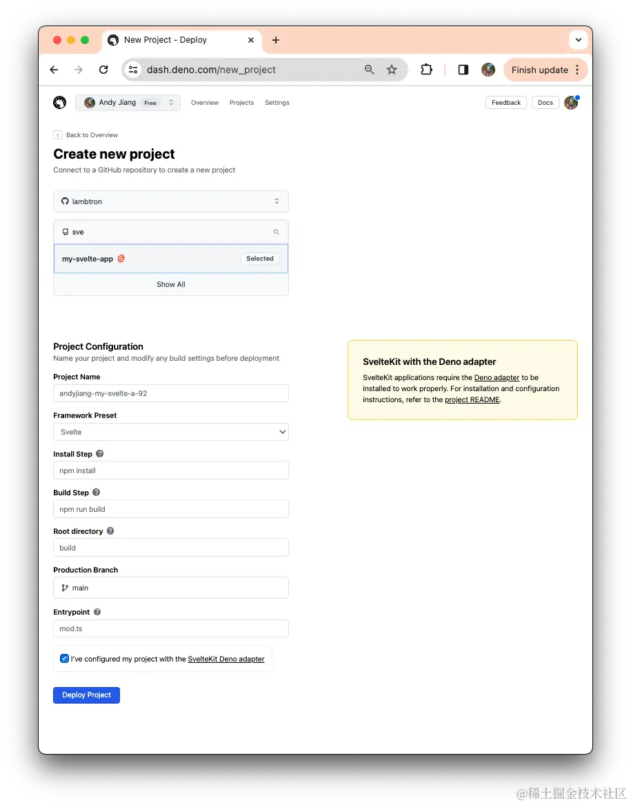 Deno Deploy 自动使用 Svelte 安装和构建命令填充配置字段。