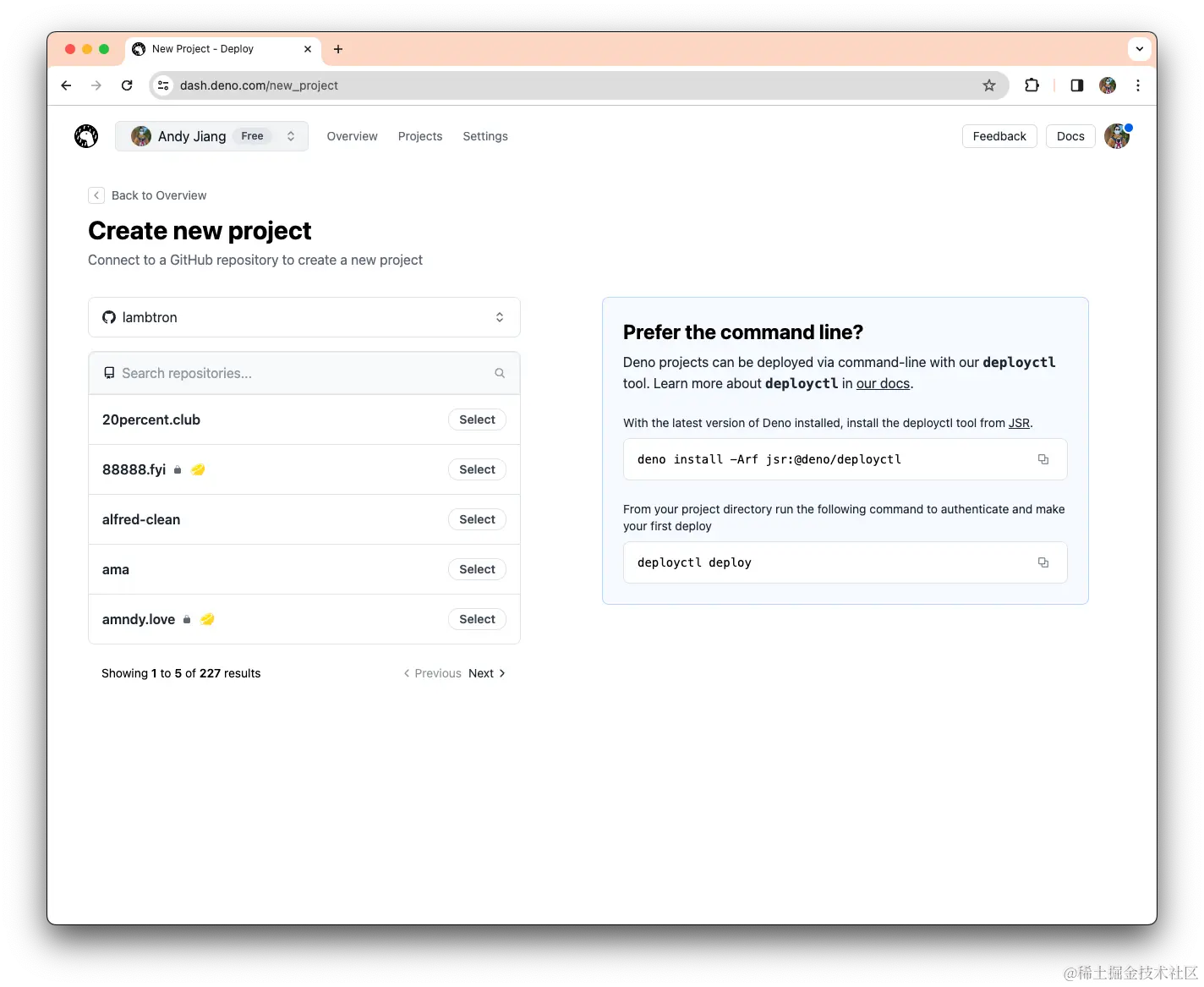 让我们从现有的 GitHub 存储库创建一个新的 Deploy 项目,因此我们将单击「我有一个现有项目」。下一个屏幕允许您连接到现有的 GitHub 项目,并提供使用 deployctl 从命令行进行部署的选项。