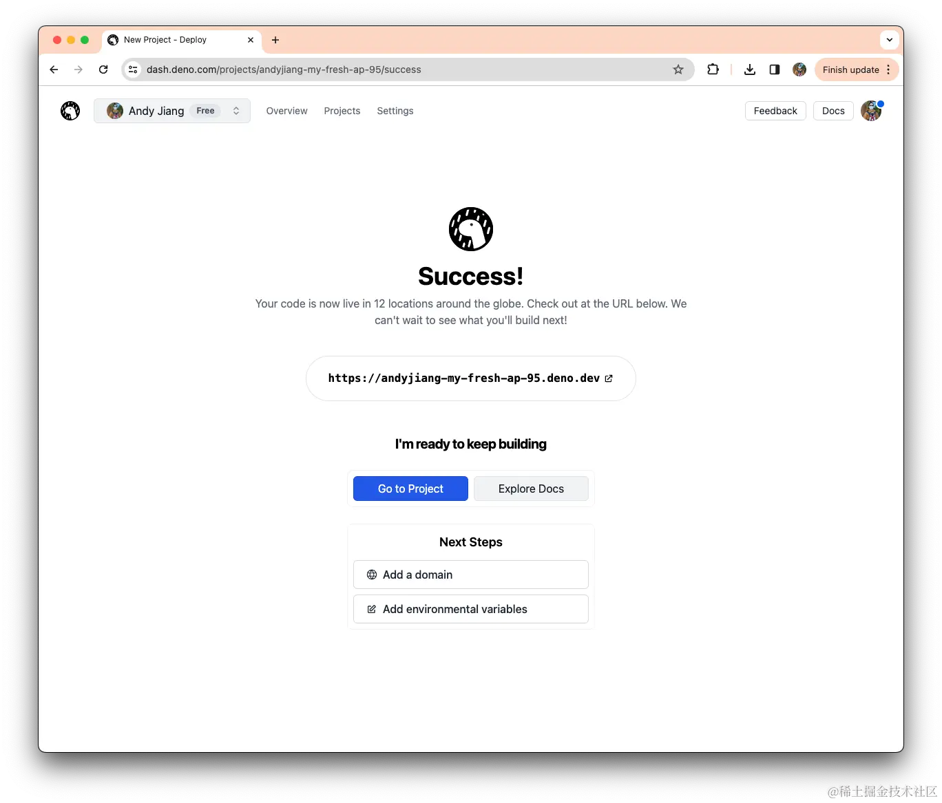 在创建项目后,可以通过你自己的 deno.dev URL 在网络上实时查看它。如果您准备好更进一步,我们通过提供跳转到设置并添加自定义域或环境变量的快捷方式,使升级新部署的项目变得更加简单。