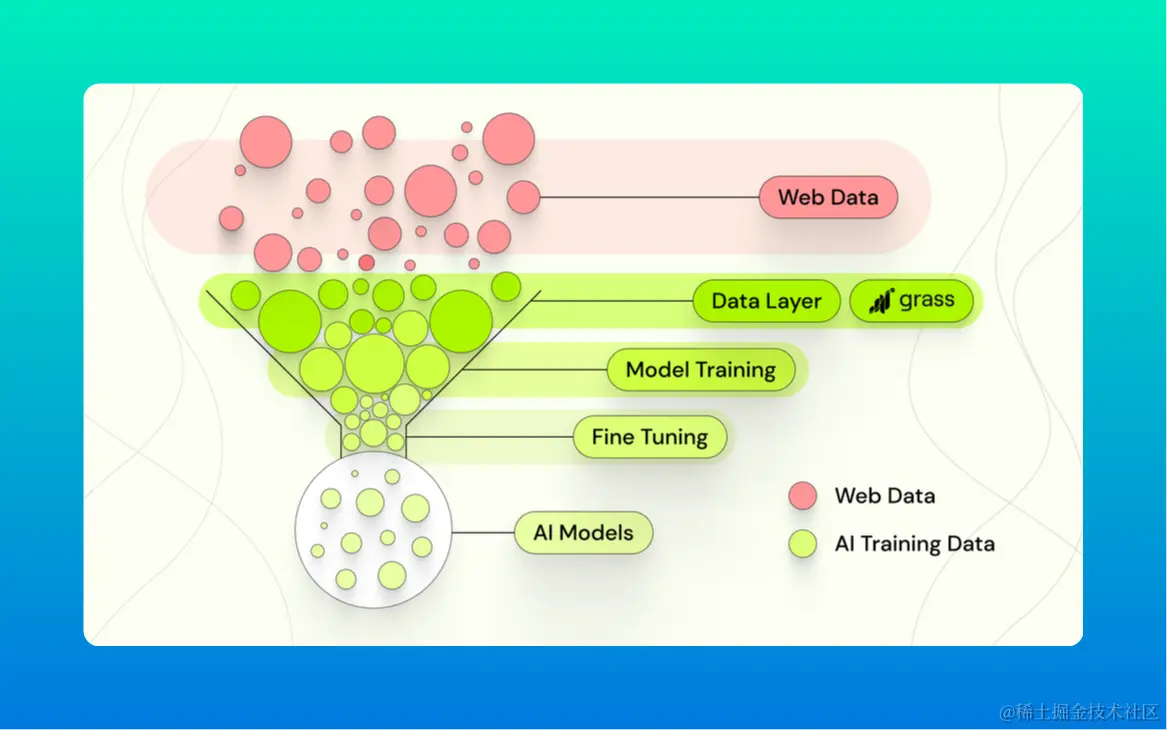 Grass是把用户没有使用到的闲置网络资源,主要是上行带宽和真实IP,通过Wynd 这家公司出售给各个需要的AI公司或者实验室等机构,让他们可以进行模型训练过程中必须要的网络调查和数据抓取,用来训练AI。