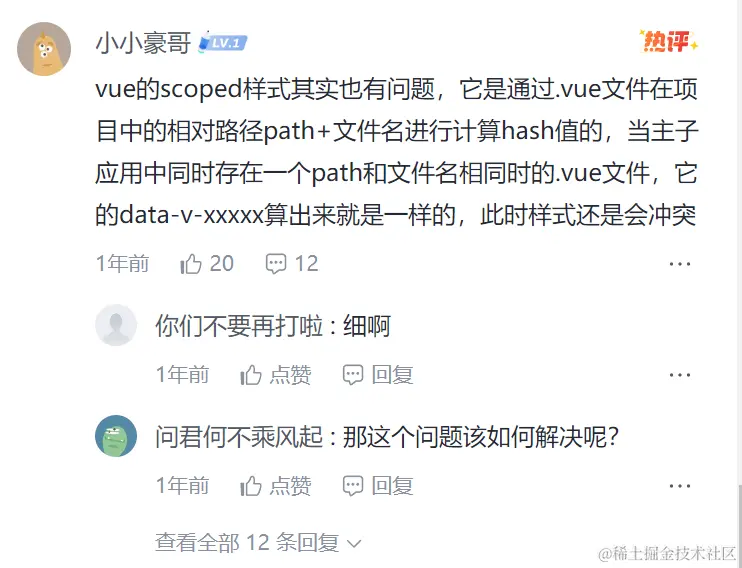 掘金有一个大佬,给 Vue 官方提了一个 PR,就是在计算 data-v-xxx的时候,加入 package.json 的 name进行计算,也就是项目名,这样能防止两个不同项目之间的样式冲突~