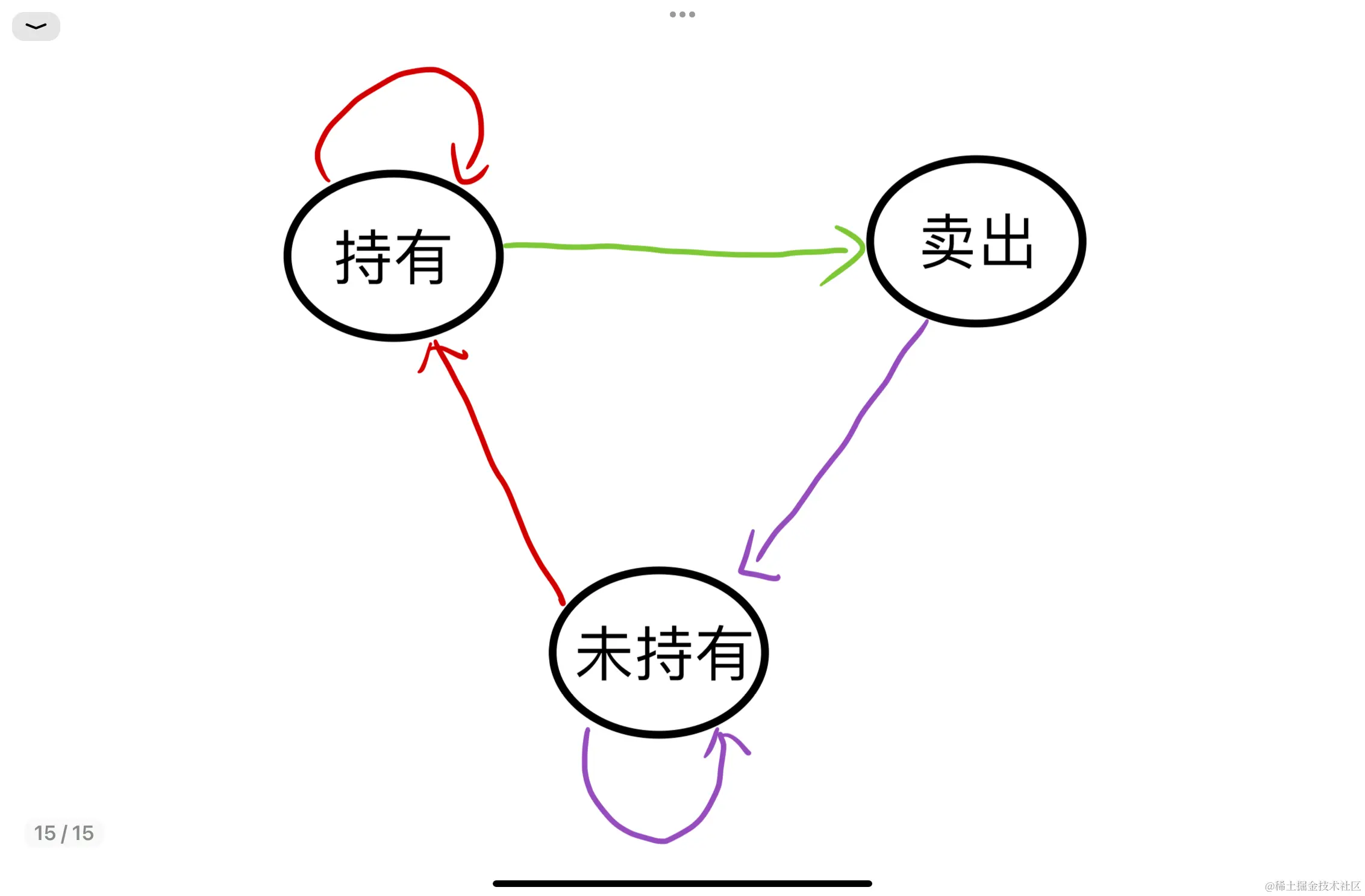 我们先分析如果今天是持有状态也就是 dp[i][0],有几种可能。假设今天是第 i 天,那么第 i - 1 天可能是持有状态,股票不卖就一直是持有状态。第二种就是第 i - 1 天是未持有状态,那么第 i 天买入股票,就变为了持有状态。持有状态有这两种可能,我们需要取其中最大的收益状态,所以 dp[i][0] = Math.max(dp[i - 1][0],dp[i - 1][1])。