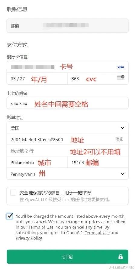 ⑥、再把卡片信息一一复制粘贴填写在GPT的付款界面即可订阅成功啦!