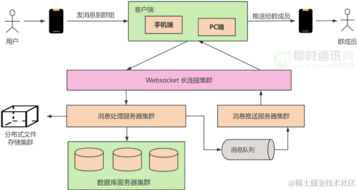 - 5) 消息推送服务器集群:这是信息的中转站,负责将消息传递给正确的群组成员;