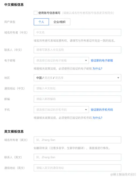 或者 通过链接console.cloud.tencent.com/domain,进入 【域名注册首页】> 【信息模板】> 新建模板 ,提交域名认证信息。