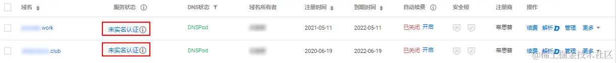 域名服务状态为未实名认证,说明您的域名还未进行认证,需要进行实名认证。点击下图的【未实名认证】 标签