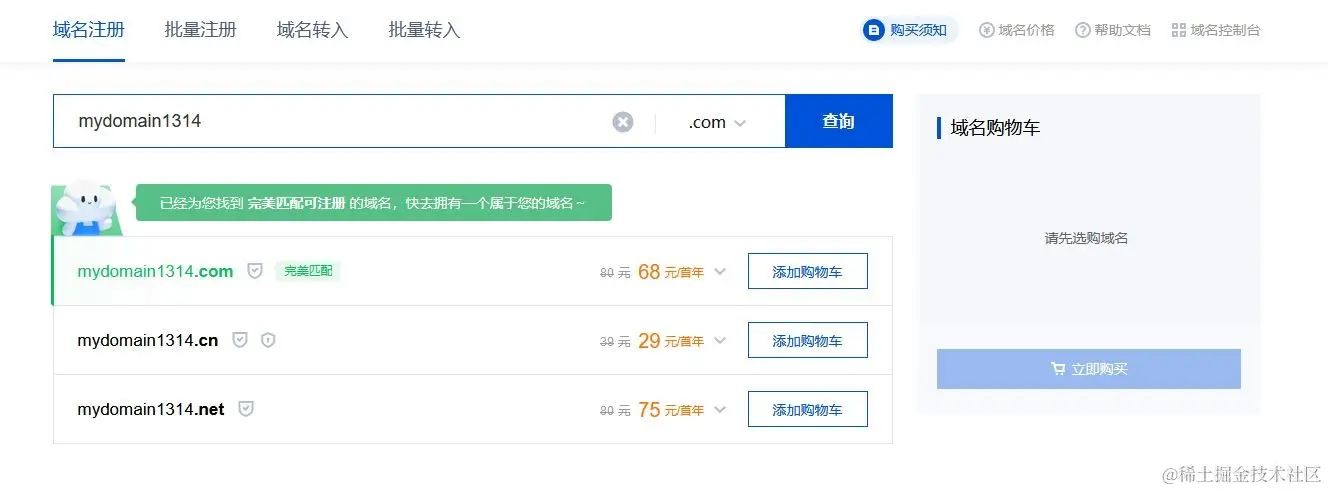 推荐购买com,cn,net主流域名,非主流域名可能会无法备案,根据流程完成域名的购买