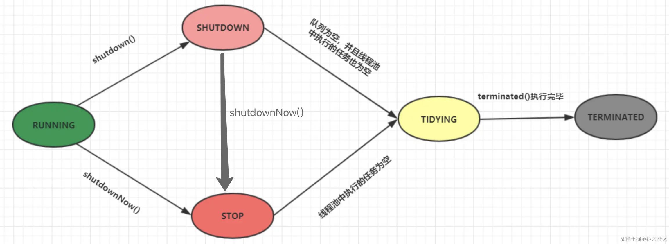 - 调用线程池的shutdownNow()方法时,线程池由(RUNNING or SHUTDOWN ) -> STOP