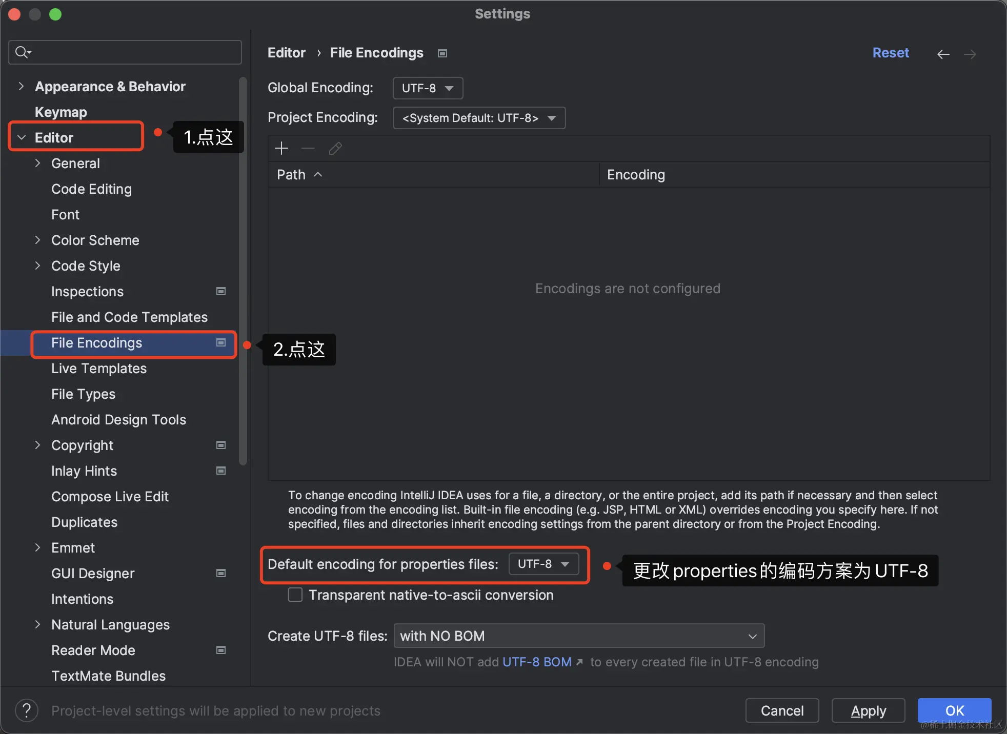 4、点击Apply+OK,这样设置完之后的项目的properties文件就都是以utf-8来编码的了,当前项目的话还需自己手动打开当前项目的设置,其他步骤和上述一样: