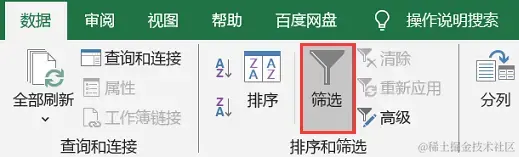 (1)通过点击数据区域的任一单元格,然后在 【数据】 选项卡中选择【筛选】,即可启用筛选功能;