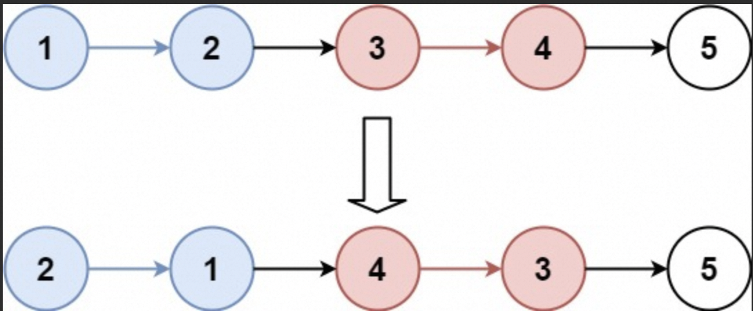 输入:head = [1,2,3,4,5], k = 2 输出:[2,1,4,3,5] 示例 2: