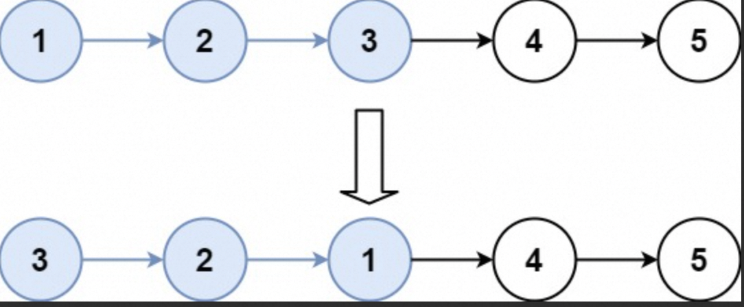 输入:head = [1,2,3,4,5], k = 3 输出:[3,2,1,4,5] 提示: 链表中的节点数目为 n 1 <= k <= n <= 5000 0 <= Node.val <= 1000 进阶:你可以设计一个只用 O(1) 额外内存空间的算法解决此问题吗?