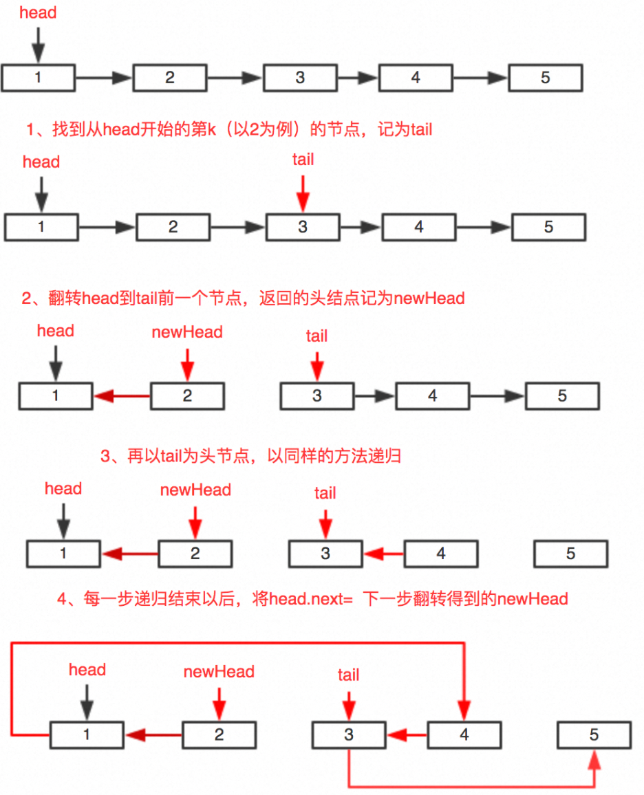 说明: reverseLinkedList 函数用于反转以 head 为头节点、tail 为尾节点的子链表,并返回反转后的链表的头节点。