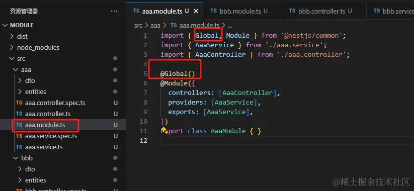 我们给 aaa 模块添加 @Global() 他便注册为全局模块
