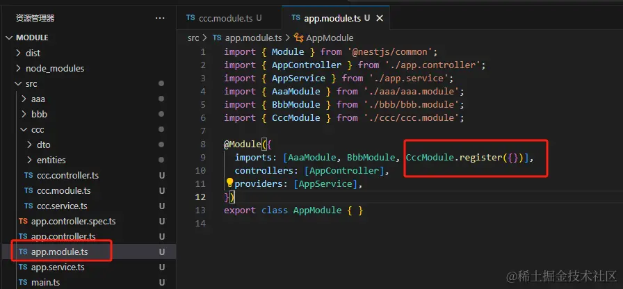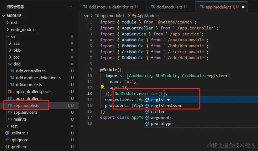 我们给 CccModule 加一个 register 的静态方法,返回模块定义的对象。和在装饰器里定义的时候的区别,只是多了一个 module 属性。
