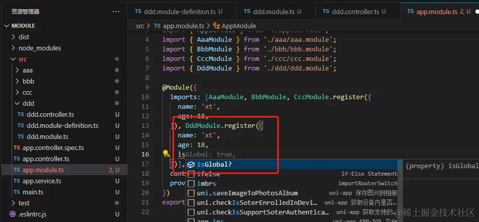 然后我们会发现一个问题, 在我们使用的时候他没有isGlobal 属性
