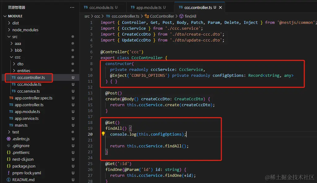 - 可以在模块级别绑定配置对象,这些配置可在模块内的服务中通过 @Inject() 注解注入和使用。