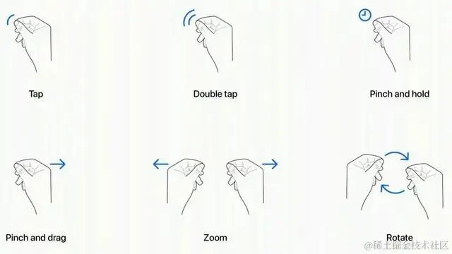 除了不限位置,Vision Pro还可以准确的识别单击、捏住和双手手势: