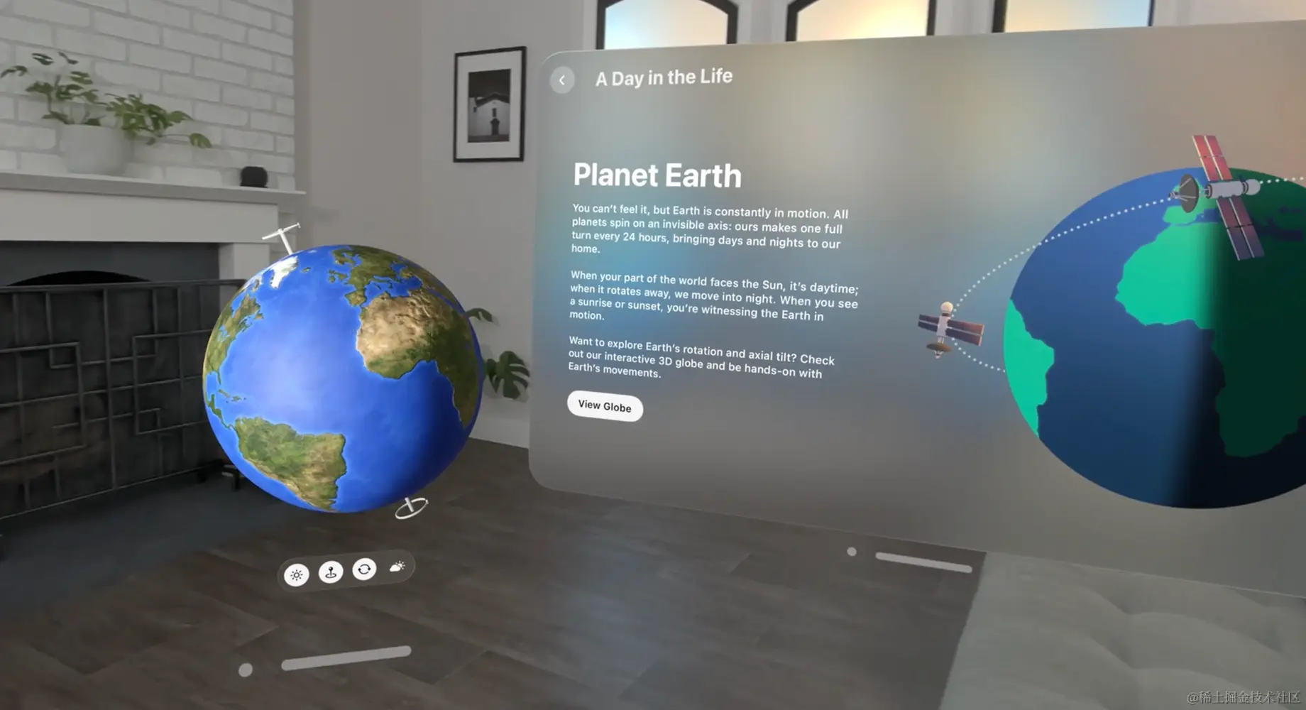 在这种场景下,visionOS会将使用者周围全部设置为可以放置UI元素的区域,周围的所有空间都可以作为开发者的“画布”,你可以在任意位置放置2D、3D模型。但是需要注意的是这种场景理论上只应创建一个。