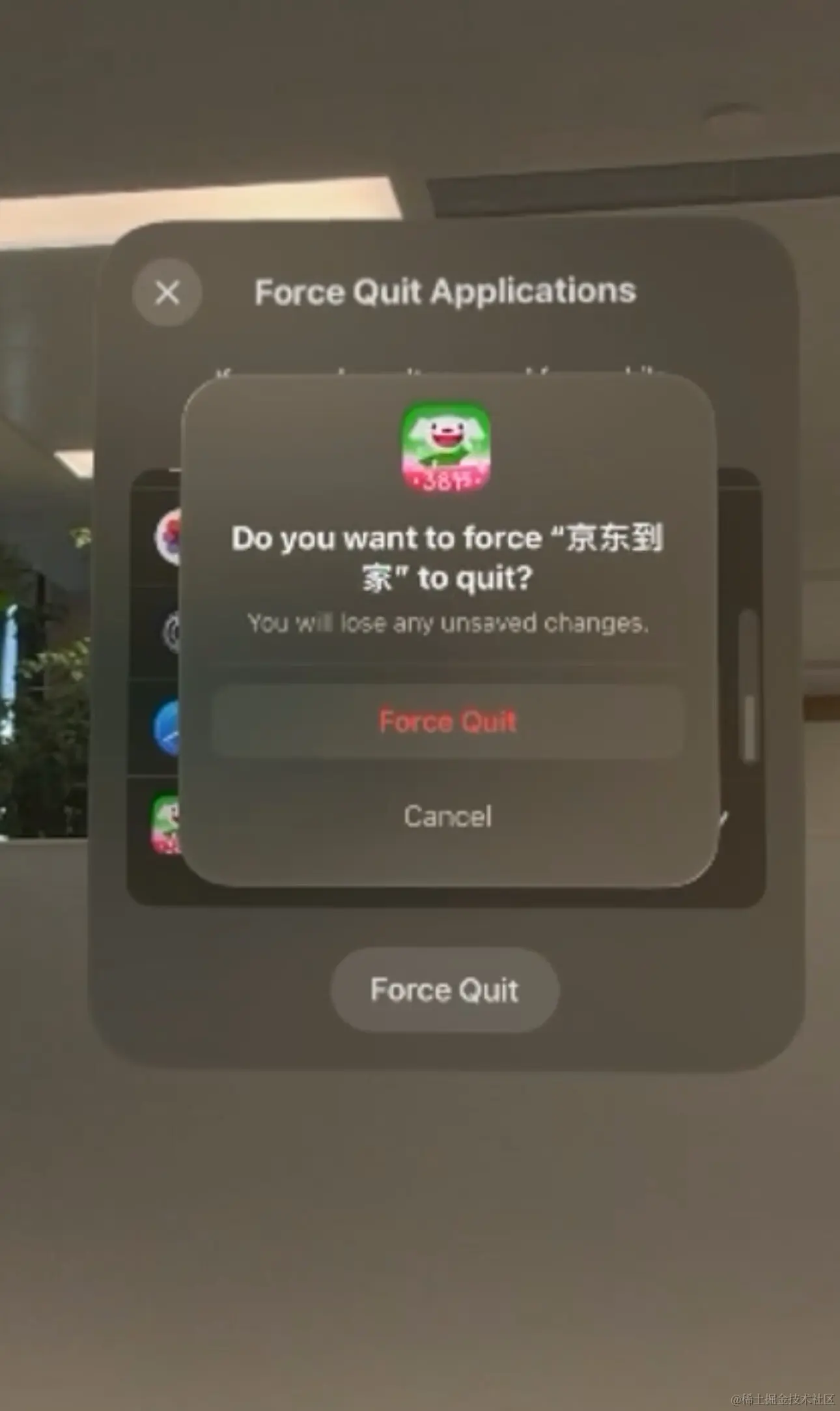 同时,在App下端会展示两个控制元素,一个小圆点和一个横条。眼睛看向小圆点的话,它会变成一个叉号,用于关闭App(退至后台),需要完全杀死App的话,逻辑则类似于Mac电脑的杀死进程,需要同时按住Vision Pro的返回键和表冠2秒,然后再应用列表中找到 App强制结束