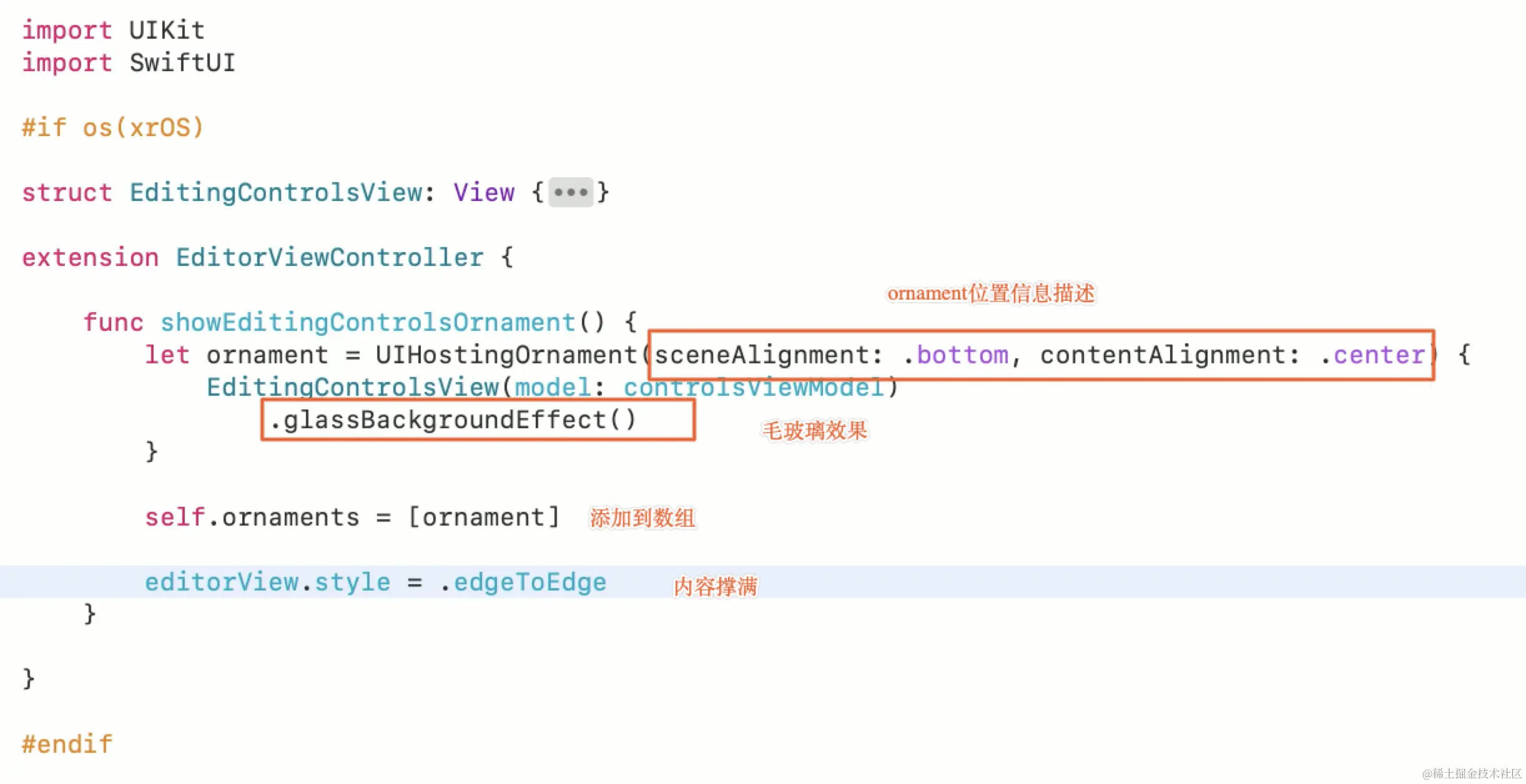 在visionOS app中,为了提高场景的沉浸感,苹果允许把导航栏、tab栏和工具栏等内容无关的元素设置到界面外,并且给他们起了一个独特的名字:ornament。使用系统自带的UIHostingOrnament: