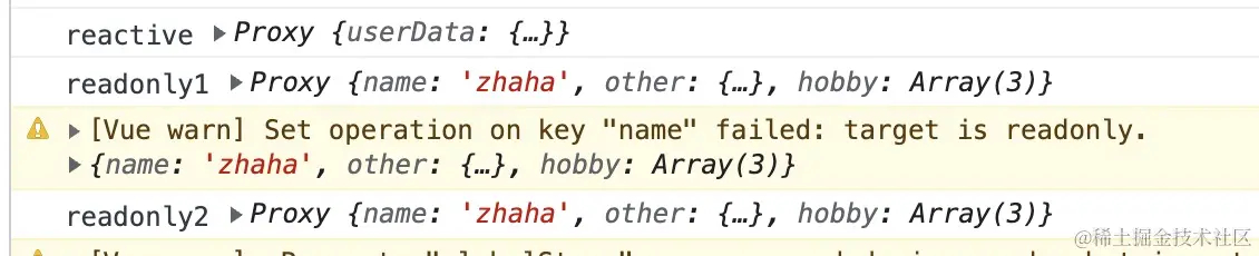 至于页面没有执行数据的副作用函数, 是因为 readonly 的 逻辑其实就是把一个数据的 set监听给忽略, 代码大概逻辑如下, 具体的可以去看一下 vue源码中关于响应式系统中的代码