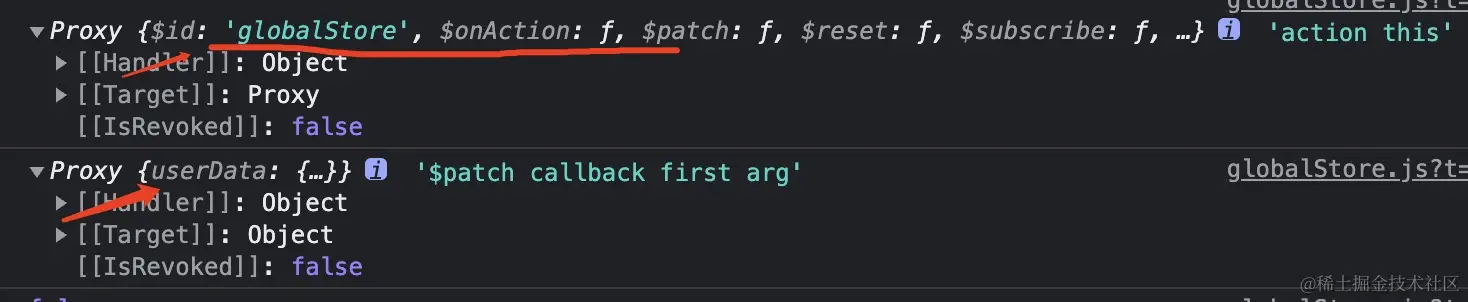打印发现 在action中的this 与 $patch 的callback中 拿到的 state 不是同一个数据