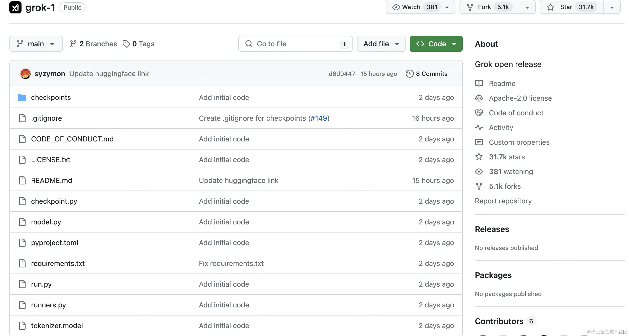 由于模型规模较大(314B参数),需要有足够GPU、内存的机器才能使用示例代码测试模型。