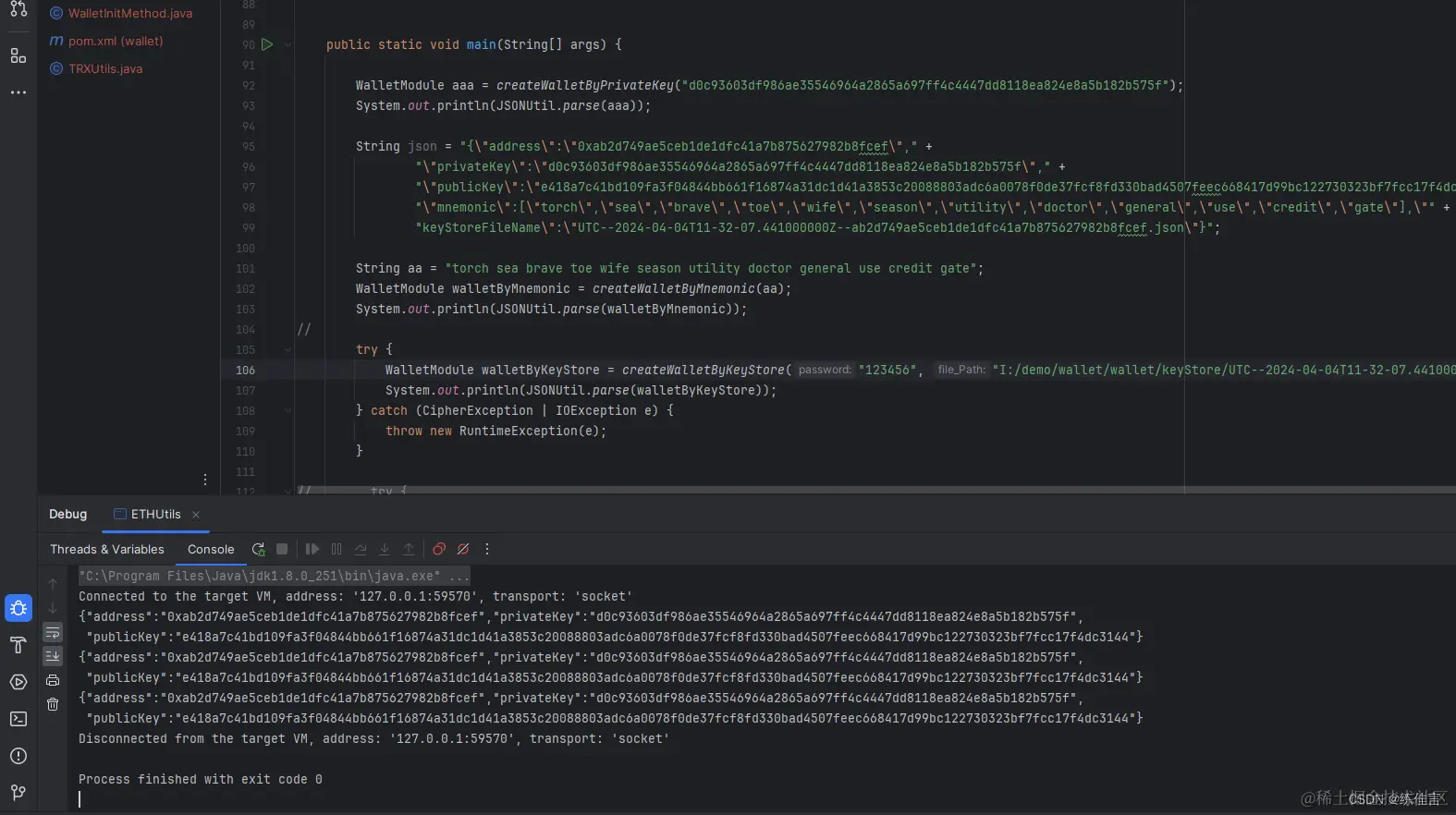 下面是一些算法,就是16进制转字符串啊,这些东西,我们在生成钱包后返回的是一个10进制byte[]数组,所以我们需要转换成相应16进制的字符串,