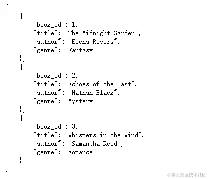 # 用带book_id, title, author, genr的JSON格式输出三个编造的书名、作者以及流派的列表