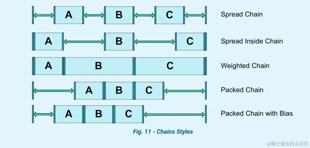 上述与父视图对齐相关(当前视图的包含 margin 的 content-box 盒子与父视图的 border-box 里面除去 padding 的 content 区域对齐)。