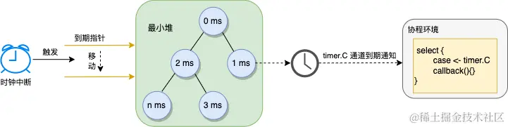 - 而 Go 语言中的定时器回调是利用了 channel 信号通道来实现的。