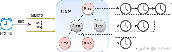 内核通过红黑树等数据结构来组织和管理定时器事件,这些事件按照触发时间从早到晚排列。当一个定时器事件的触发时间到达时,在时钟中断处理程序中,内核将相应的定时器事件从红黑树中移除,并将其添加到已到期的定时器链表中。同时,内核会唤醒等待该定时器事件的任务,让任务触发执行。