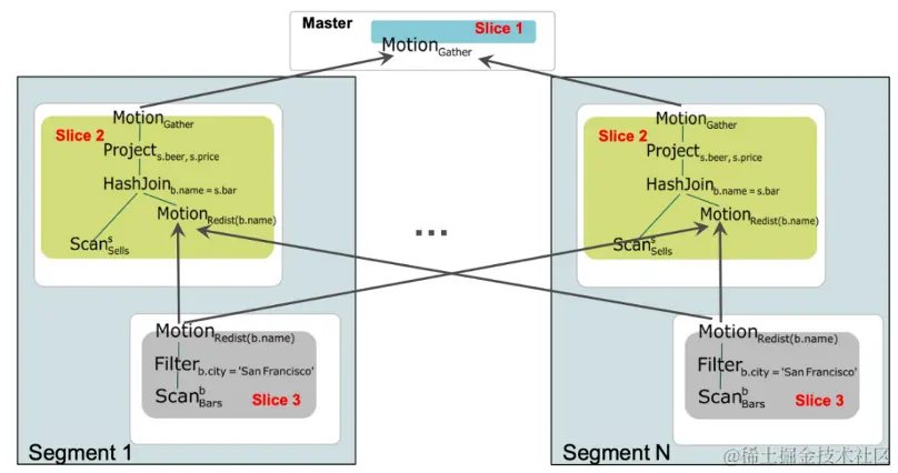 在这个阶段的MPP架构在技术实现基于传统数据库实例进行扩展,例如Greenplum、ADB for PG等都是基于PostgreSQL内核进行开发,在集群中每个节点都是一个独立的数据库实例,具有独立的系统表、用户表等,数据是按照某种策略分布到不同的实例中。客户端在发起请求后由管理节点生成查询计划并进行并行化调度,当涉及到多个节点的数据交换时,例如HashJoin的执行,引入数据交换算子,如下图所示: