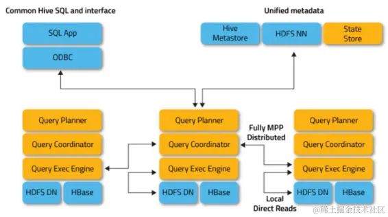 从上面介绍的大数据架构的数仓能力来看为了支持大数据量处理、扩展性和容错性等能力,将不同的组件按照一定的架构“范式”进行叠加,存在架构极其复杂且维护成本很高,采用分布式处理框架查询性能比较低,而且事务支持较弱等问题,因此无法替代传统数仓。但是传统数仓存在集群规模小、并发能力不高、动态扩展性差等问题,因此业界出现了大数据数仓和传统数仓进行互补的新式架构的数仓。在大数据的存储能力基础上使用MPP的架构优势提高计算的实时型,典型数仓产品Impala、Presto/Trino、Hawq等产品,这里以Impala为例,其架构如下图所示: